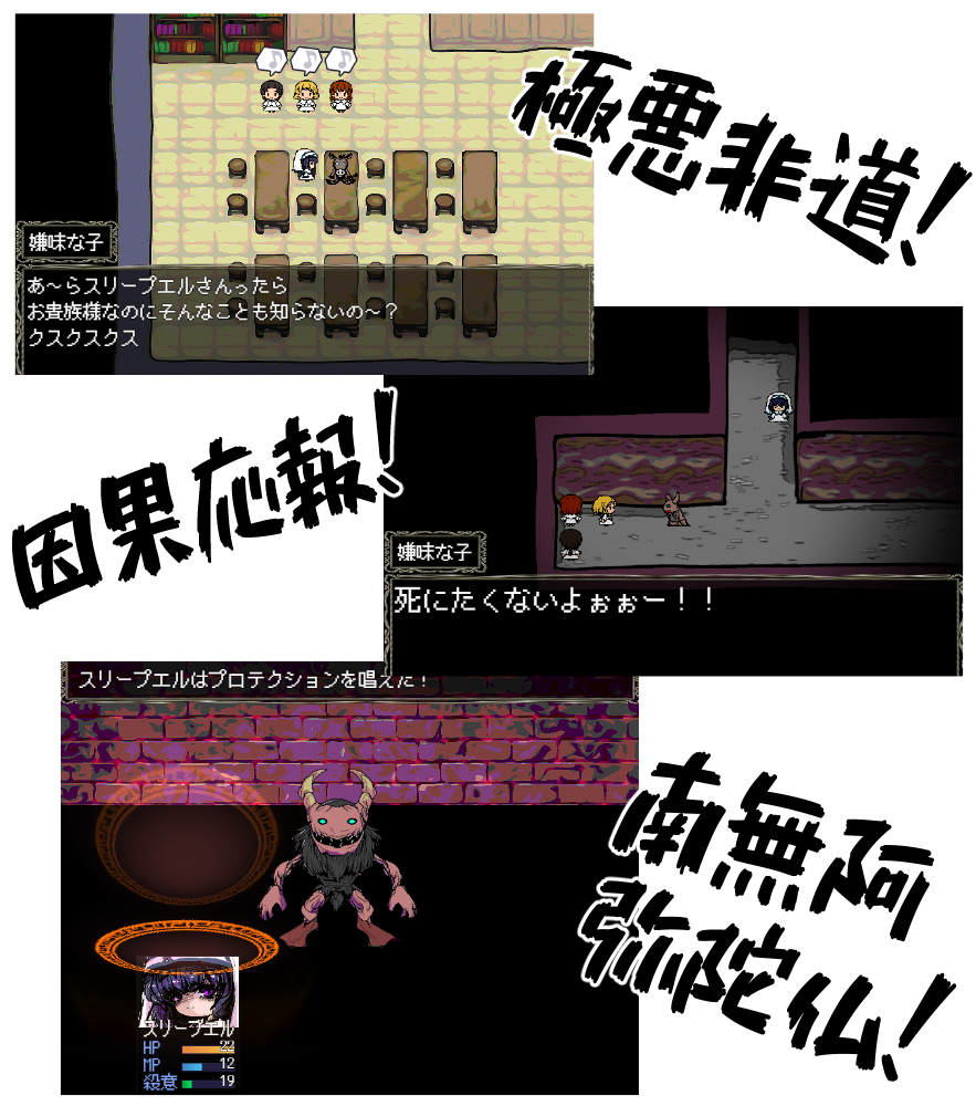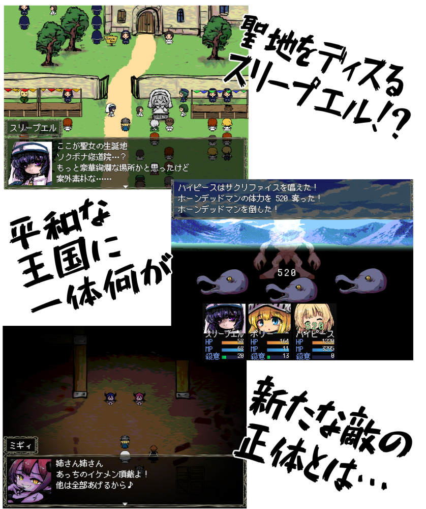 スリープエル 元は伯爵令嬢だったが父親が裏で悪事を 働いていたことが露見し、一家は没落。 今は聖職者学校の寄宿舎で暮らしている。 スリープエルは偽名。しかしゴルド伯爵の娘だということは知れ渡っている。 父のこともあり、いつまでも学校には馴染めていなかった。 その事を心配した先生は スリープエルに春休みの聖地巡礼を勧めた。 前作にてロバ鞄をくれた少女、今作の主人公。 父親は前作でモンスターホームと化していたがモーニン一味に退治された |